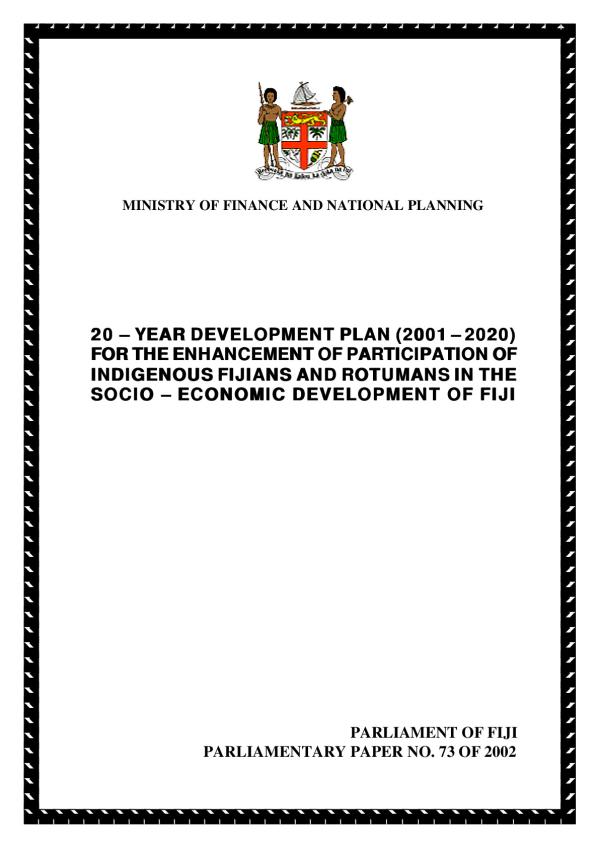 One of the most pressing issues confronting present day Fiji is the equitable distribution of the fruits of development between and within ethnic groups as well as geographically. Related to this is the issue of how to maximise the economic productivity of Fijians and Rotumans in relation to their natural resources. Resolving these concerns are more urgent now as the recent political crisis clearly indicated that ethnic grievances played a prominent contributing role and can no longer be ignored. Against this background, this Plan outlines, in an integrated and coherent framework, policy initiatives aimed at enhancing the participation of Fijians and Rotumans (hereinafter, called indigenous Fijians) in the national socio-economic development.