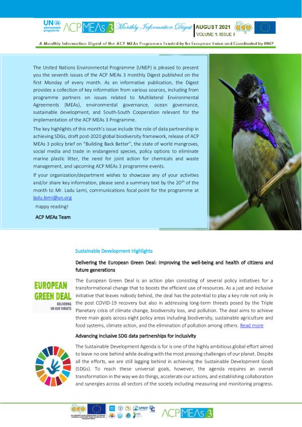 This is an informative publication, the Digest provides a collection of key information from various sources, including from programme partners on issues related to Multilateral Environmental Agreements (MEAs), environmental governance, ocean governance, sustainable development, and South-South Cooperation relevant for the implementation of the ACP MEAs 3 Programme.