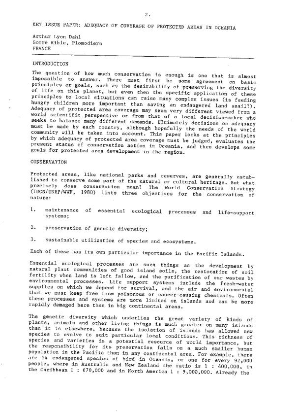 The Question of how much Conservation is enough is one that is almost impossible to answer. There must first be some agreement on basic principles or goals, such as the desirability of preserving the diversity of life on this planet, but even then the specific application of these principles to local situations can raise many complex issues (is feeding hungry children more important than saving an endangered land snail?) Adequacy of protected area coverage may seem very different viewed from a world scientific perspective or from that of a local decision-maker who seeks to balance many different demands. Ultimately decisions on adequacy must be made by each country, although hopefully the needs of the world community will be taken into account. This paper looks at the principles by which adequacy of protected area coverage must be judged, evaluates the present status of conservation action in Oceania, and then develops some goals for protected area development in the region.