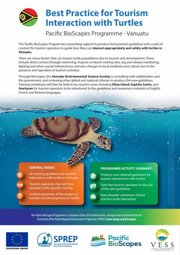 The Pacific BioScapes Programme is providing support to produce best practice guidelines and a code of conduct for tourism operators to guide how they can interact appropriately and safely with turtles in Vanuatu. Through BioScapes, the Vanuatu Environmental Science Society is consulting with stakeholders and the government, and reviewing other global and national criterias to produce the new guidelines.