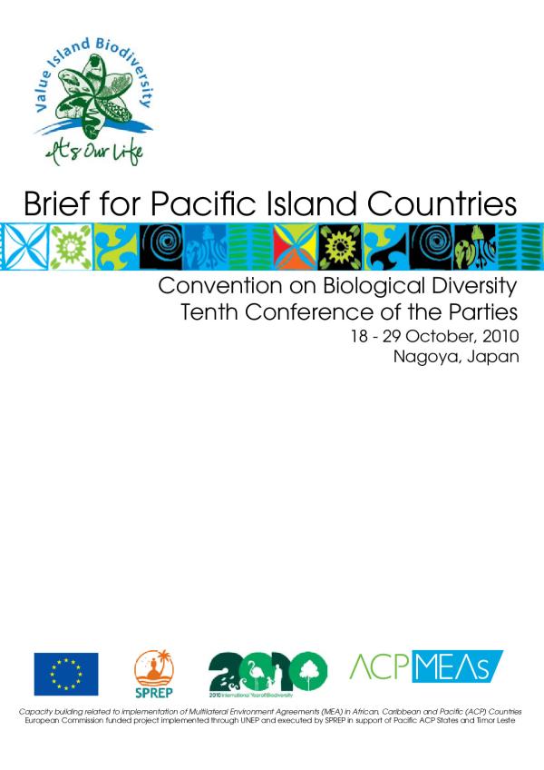 Convention on Biological Diversity Convention on Biological Diversity Tenth Conference of the Parties Brief for Pacific Island Countries 18 - 29 October, 2010 Nagoya, Japan Capacity building related to implementation of Multilateral Environment Agreements (MEA) in African, Caribbean and Pacific (ACP) Countries European Commission funded project implemented through UNEP and executed by SPREP in support of Pacific ACP States and Timor LestePACIFIC CBD COP 10 Brief 1 Introduction The Pacific CBD COP10 Brief (Pacific Brief) was prepared in response to a request by Pacific Island Countries at the Pacific regional CBD COP10 preparatory meeting held in Nadi, Fiji from the 16-18 August, 2010. The overall purposes of the Pacific Brief are to provide substantive information on key agenda items that are of relevance to the Pacific and to propose possible positions for the 14 Pacific Island Countries that are parties to the CBD to consider and take forward as part of the One Pacific Voice approach. SPREP, w