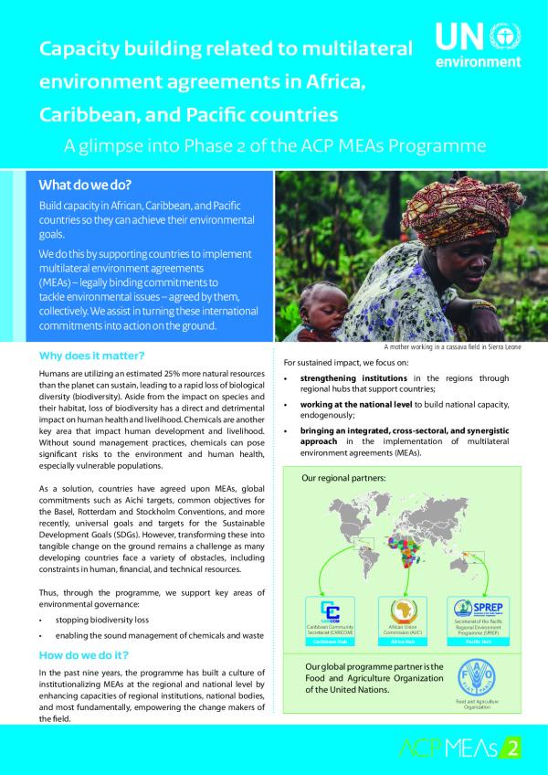 Many developing countries are unable to fulfil their obligations as signatories of multilateral environmental agreements (MEAs) as they tackle increasingly complex scientific and technical issues. Inadequate human, financial, and technical capacity are some of the constraints that severely impact their ability to implement MEAs. In order to address this pressing issue, the United Nations Environment Programme (UN Environment) and the Food and Agriculture Organization of the United Nations (FAO) have joined forces with the European Commission (EC) and the ACP Secretariat (African, Caribbean, Pacific Group of States Secretariat) and regional organizations, namely, the Secretariat of the Pacific Regional Environment Programme (SPREP), the Caribbean Community Secretariat (CARICOM) and the African Union Commission (AUC) to enhance the capacity of African, Caribbean and Pacific (ACP) countries to improve the implementation of specific MEAs.