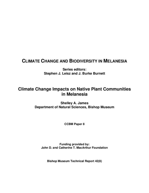 Melanesia is a hotspot of diversity for vascular and non-vascular plant species, with estimated species endemism as high as 80% for New Guinea. The current lack of sitespecific climate and species information is a major impediment to the assessment of possible effects of climate change on islands within Melanesia. Plant communities predicted to be impacted most by the effects of climate change are the mangrove and coastal systems, montane systems, and dryland vegetation communities. However, anthropogenic effects, such as land-clearing, logging, and fire, may have greater effects on diversity in the short-term. Research needs for the area include intensive botanical surveys, physiological and phenological assessments of plant species to the effects of climate change, and long-term monitoring to determine baseline and trends in biodiversity and community structure.