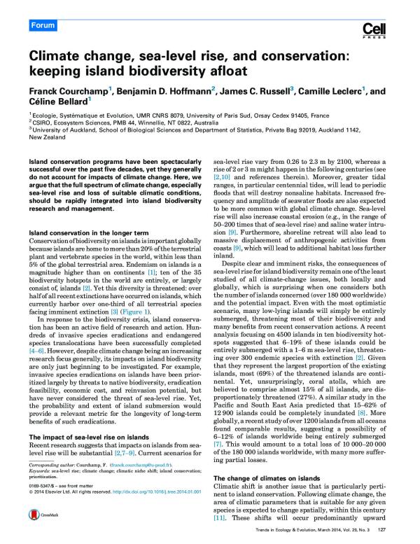 Island conservation programs have been spectacularly successful over the past five decades, yet they generally do not account for impacts of climate change. Here, we argue that the full spectrum of climate change, especially Island conservation programs have been spectacularly successful over the past five decades, yet they generally do not account for impacts of climate change. Here, we argue that the full spectrum of climate change, especially sea-level rise and loss of suitable climatic conditions, should be rapidly integrated into island biodiversity research and management. Sea-level rise and loss of suitable climatic conditions, should be rapidly integrated into island biodiversity research and management. Record Created: 22-Aug-2018