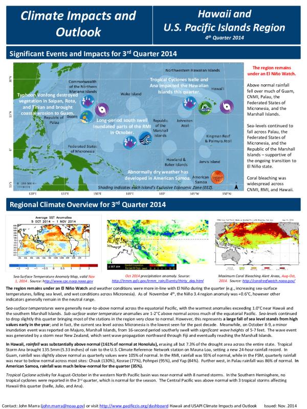 The region remains under an ElNiño watch and weather conditions were in more in-line with El Niño during the quarter. Sea-surface temperatures were generally near to above normal across the equatorial Pacific, with the warmest anomalies, exceeding 1.o degree celcius near Hawaiiand the Southern marshall islands.