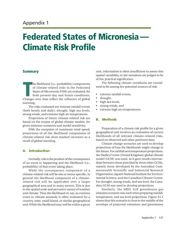 The likelihood (i.e., probability) components of climate-related risks in the Cook Islands are evaluated, for both present-day and future conditions. Changes into the future reflect the influence of global warming. The risk events for which current and future likelihoods are evaluated are extreme rainfall events (both hourly and daily), drought, high sea levels, strong winds, and extreme high air temperatures. Tropical cyclone frequencies over the past century are also examined. Some climate-related human health and infrastructure risks are also investigated.