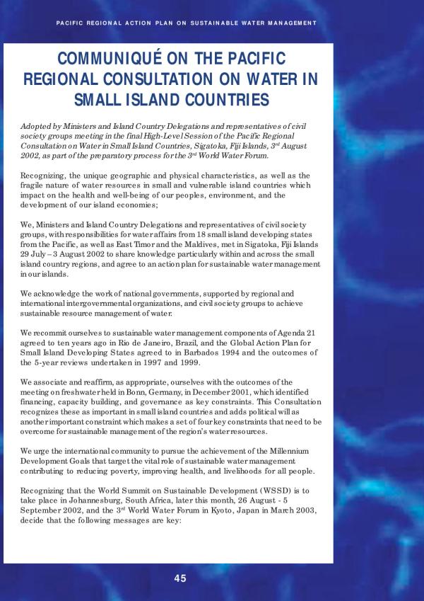 Recognizing, the unique geographic and physical characteristics, as well as the fragile nature of water resources in small and vulnerable island countries which impact on the health and well-being of our peoples, environment, and the development of our island economies; We, Ministers and Island Country Delegations and representatives of civil society groups, with responsibilities for water affairs from 18 small island developing states from the Pacific, as well as East Timor and the Maldives, met in Sigatoka, Fiji Islands 29 July 3 August 2002 to share knowledge particularly within and across the small island country regions, and agree to an action plan for sustainable water management in our islands.