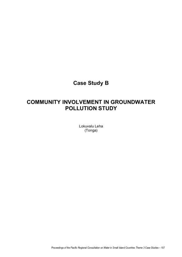 Microsoft Word - Part V_Th3.doc Proceedings of the Pacific Regional Consultation on Water in Small Island Countries Theme 3 Case Studies â 107 Case Study B COMMUNITY INVOLVEMENT IN GROUNDWATER POLLUTION STUDY Lokuvalu Leha (Tonga) Proceedings of the Pacific Regional Consultation on Water in Small Island Countries Theme 3 Case Studies â 108 1.0 INTRODUCTION Water is one of the vital needs for daily life throughout every Country in the world, so we have a huge responsibility, not only because we need a continuous supply of water, but because we also need that water to be pure and clean. The aim of this paper is to describe a process of community education and understanding regarding groundwater pollution and water conservation. It is a useful study because it has many aspects and the understanding and developments have progressed over five years. Some outcomes were planned and some were unexpected