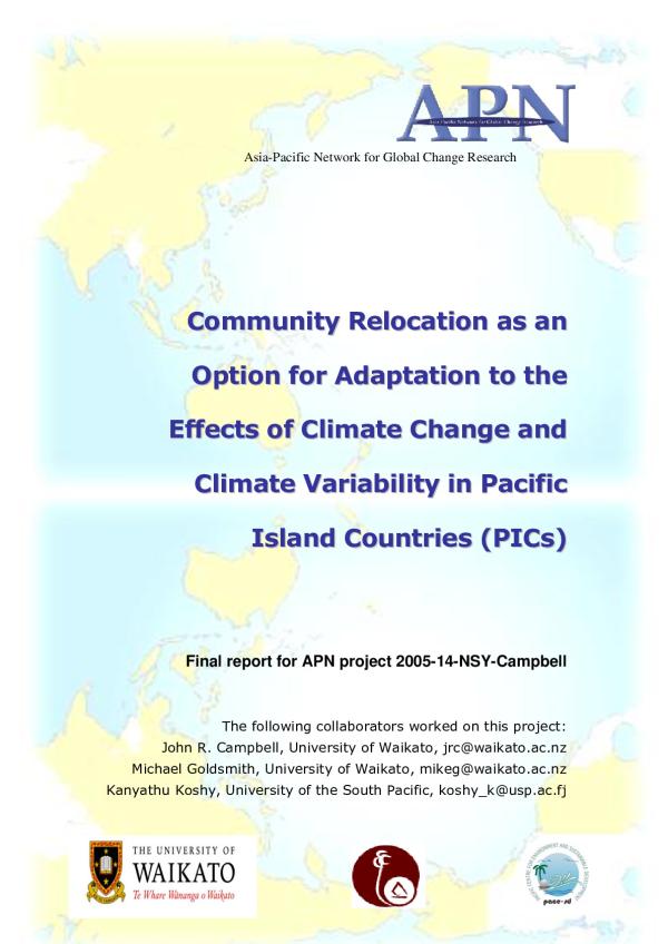Microsoft Word - 23_fr_overviewtechincal_fweb.doc 1 Asia-Pacific Network for Global Change Research CCoommmmuunniittyy RReellooccaattiioonn aass aann OOppttiioonn ffoorr AAddaappttaattiioonn ttoo tthhee EEffffeeccttss ooff CClliimmaattee CChhaannggee aanndd CClliimmaattee VVaarriiaabbiilliittyy iinn PPaacciiffiicc IIssllaanndd CCoouunnttrriieess ((PPIICCss)) Final report for APN project 2005-14-NSY-Campbell The following collaborators worked on this project: John R. Campbell, University of Waikato, [email protected] Michael Goldsmith, University of Waikato, [email protected] Kanyathu Koshy, University of the South Pacific, [email protected] 2 Community Relocation as an Option for Adaptation to the Effects of Climate Change and Climate Variability in Pacific Island Countries (PICs) 2005-14-NSY-Campbell Final Report submitted to APN ©Asia-Pacific Network for Global Change Research 3 Overview of project work and outcomes