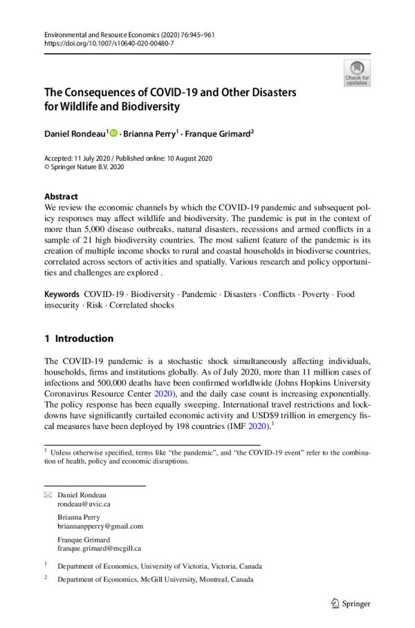 We review the economic by which the COVID-19 pandemic and subsequent policy responses may affect wildlife and biodiversity. The pandemic is put in the context of more than 5,000 diseases outbreak, natural disasters, recessions and armed conflicts in a sample of 21 high biodiversity countries.