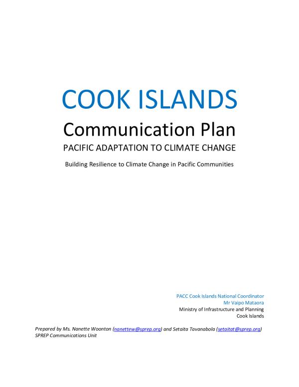 COOK ISLANDS Communication Plan PACIFIC ADAPTATION TO CLIMATE CHANGE Building Resilience to Climate Change in Pacific Communities PACC Cook Islands National Coordinator Mr Vaipo Mataora Ministry of Infrastructure and Planning Cook Islands Prepared by Ms. Nanette Woonton ([email protected]) and Setaita Tavanabola ([email protected]) SPREP Communications Unit mailto:[email protected]�mailto:[email protected]� The Pacific Adaptation to Climate Change Project is implemented by the United Nations Development Programme in partnership with the Secretariat of the Regional Environment Programme, and funded by the Global Environment Facility and the Australian Agency for International Development. It is nationally executed by the Ministry of Infrastructure and Planning. Table Contents BACKGROUND of PACC ......................................................................