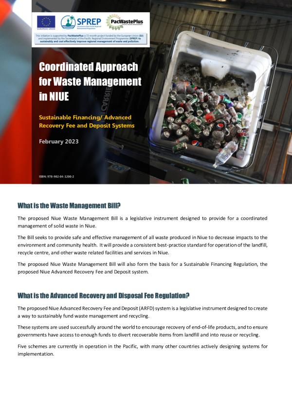 The proposed Niue Waste management bill is a legislative instrument designed to provide for a coordinated management of solid waste in Niue. The Bill seeks to provide a safe and effective management of all waste produce in Niue to decrease impacts to the environment and community health.