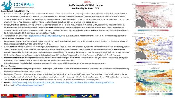 Ocean Outlook, fortnight to 04 July: • Sea surface temperature (SST) forecasts more than 0.8°C above-normal are favoured in the following country Exclusive Economic Zone (EEZs): northern CNMI, Guam, eastern Palau, northern RMI, western and southern FSM, PNG, western and central Solomon Is., Vanuatu, New Caledonia, western and southern Fiji, southern and western Tonga, patches of southern French Polynesia, and central and southern Pitcairn Is. SST anomalies above 1.2°C are favoured in eastern PNG mainland, most of New Caledonia, southern Fiji and southern Tonga. Elsewhere, SSTs are predicted to be near-normal.