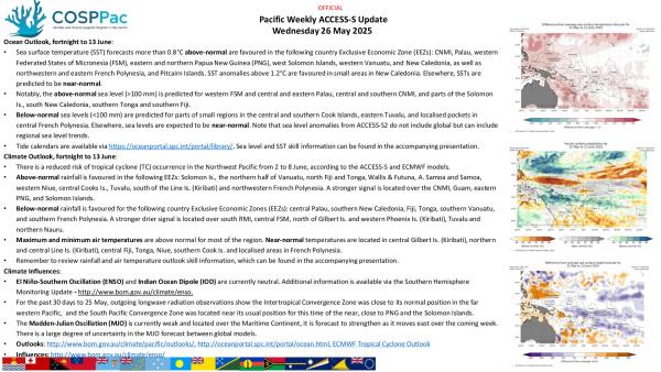 Ocean Outlook, fortnight to 13 June: • Sea surface temperature (SST) forecasts more than 0.8°C above-normal are favoured in the following country Exclusive Economic Zone (EEZs): CNMI, Palau, western Federated States of Micronesia (FSM), eastern and northern Papua New Guinea (PNG), west Solomon Islands, western Vanuatu, and New Caledonia, as well as northwestern and eastern French Polynesia, and Pitcairn Islands. SST anomalies above 1.2°C are favoured in small areas in New Caledonia. Elsewhere, SSTs are predicted to be near-normal.