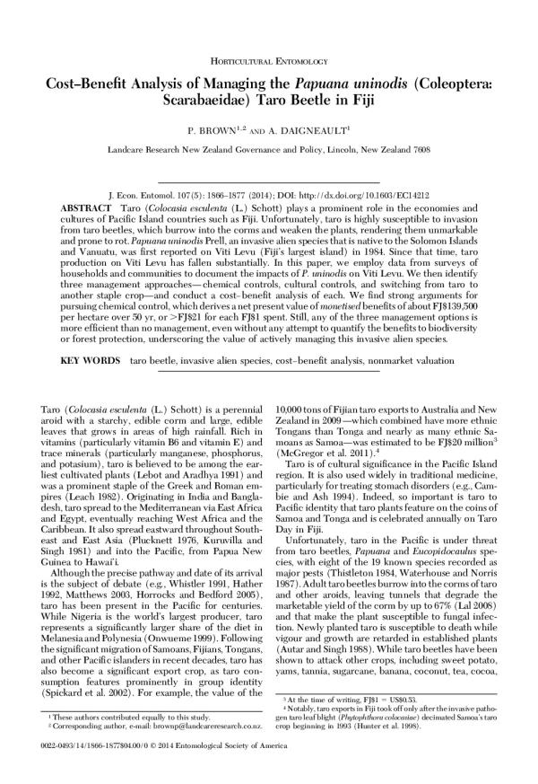 Taro (Colocasia esculenta (L.) Schott) plays a prominent role in the economies and cultures of Pacific Island countries such as Fiji. Unfortunately, taro is highly susceptible to invasion from taro beetles, which burrow into the corms and weaken the plants, rendering them unmarkable and prone to rot. Papuana uninodis Prell, an invasive alien species that is native to the Solomon Islands and Vanuatu, was first reported on Viti Levu (Fiji's largest island) in 1984. Since that time, taro production on Viti Levu has fallen substantially. In this paper, we employ data from surveys of households and communities to document the impacts of P. uninodis on Viti Levu. We then identify three management approaches-chemical controls, cultural controls, and switching from taro to another staple crop-and conduct a cost-benefit analysis of each. We find strong arguments for pursuing chemical control, which derives a net present value of monetised benefits of about FJ$139,500 per hectare over 50 yr, or >FJ$21 for each FJ$1 spent. Still, any of the three management options is more efficient than no management, even without any attempt to quantify the benefits to biodiversity or forest protection, underscoring the value of actively managing this invasive alien species.