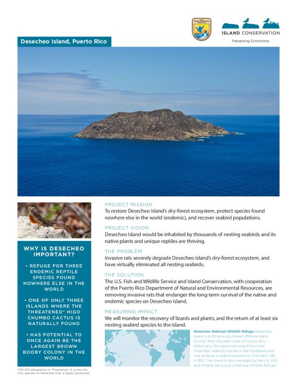 Desecheo Island supports important populations of plants, as well as animals found nowhere else in the world such as the Desecheo Anole, Desecheo Ameiva, and Desecheo Dwarf Gecko. Before the introduction of invasive rats, the island hosted large colonies of breeding seabirds, including the worlds largest Brown Booby colony and an important Red-footed Booby colony. But, due to the destruction of native vegetation and predation on eggs and chicks by these invasive rats, seabirds no longer nest on Desecheo and many plants and animals are threatened. Island Conservation and the U.S. Fish and Wildlife Service are working together to remove invasive rats from Desecheo Island. With the island free of invasive species, native plants and animals will once again be able to thrive in their natural habitat. Coral reefs in the Marine Reserve surrounding Desecheo (managed by the Department of Natural and Environmental Resources) are also expected to benefit from the islands restoration; increased vegetation will reduce soil erosion into the sea, and the seabirds will provide valuable nutrients to the adjacent marine ecosystems. Record Created: 22-Aug-2018