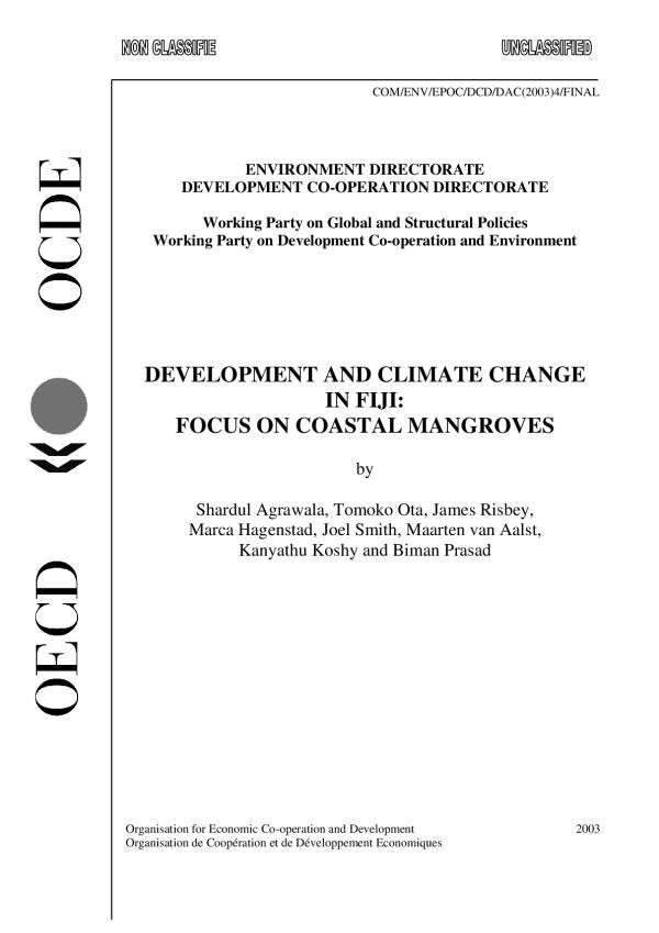 This report presents the integrated case study for Fiji carried out under an OECD project on Development and Climate Change. The report is structured around a three-tier framework. First, recent climate trends and climate change scenarios for Fiji are assessed, and key sectoral impacts are identified and ranked along multiple indicators to establish priorities for adaptation. Second, donor portfolios are analyzed to examine the proportion of donor activities affected by climate risks. A desk analysis of donor strategies and project documents as well as national plans is conducted to assess the degree of attention to climate change concerns in development planning and assistance. Third, an in-depth analysis is conducted for Fijis coastal mangroves which help reduce coastal inundation and storm surge damages, but are also themselves vulnerable to climate change