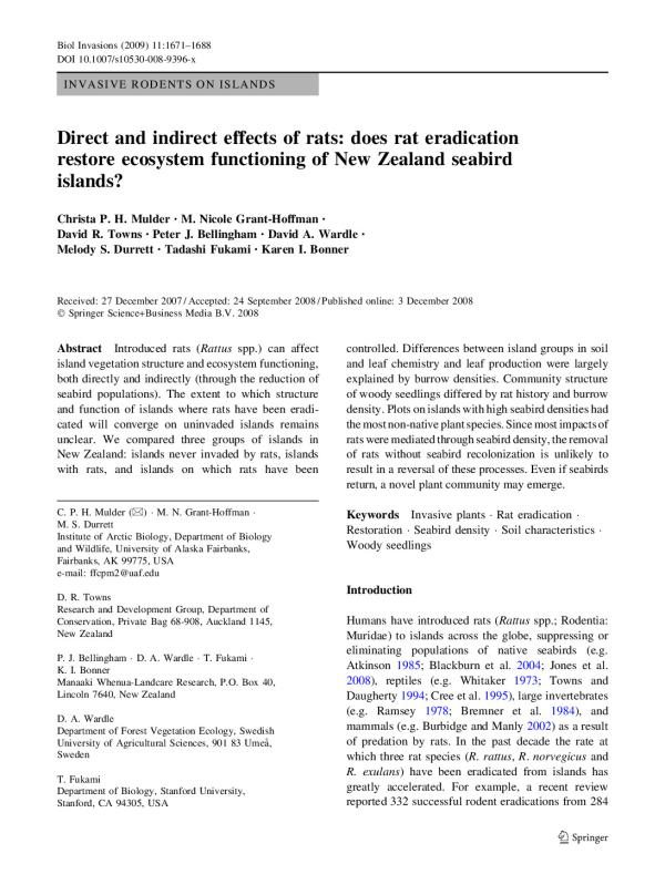 Introduced rats (Rattus spp.) can affect island vegetation structure and ecosystem functioning, both directly and indirectly (through the reduction of seabird populations). The extent to which structure and function of islands where rats have been eradicated will converge on uninvaded islands remains unclear. We compared three groups of islands in New Zealand: islands never invaded by rats, islands with rats, and islands on which rats have been controlled. Differences between island groups in soil and leaf chemistry and leaf production were largely explained by burrow densities. Community structure of woody seedlings differed by rat history and burrow density. Plots on islands with high seabird densities had themost non-native plant species. Sincemost impacts of rats were mediated through seabird density, the removal of rats without seabird recolonization is unlikely to result in a reversal of these processes. Even if seabirds return, a novel plant community may emerge. Record Created: 22-Aug-2018