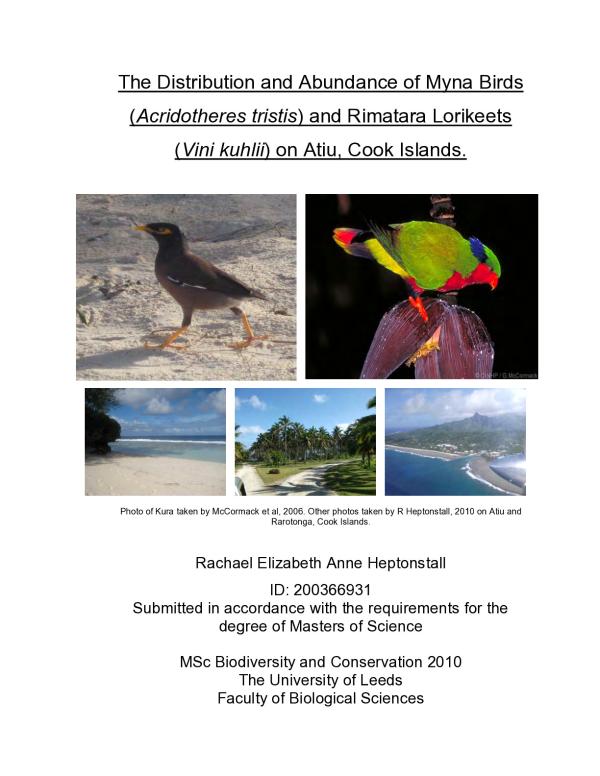 The Common Myna Acridotheres tristis was originally introduced to the island of Atiu, Cook Islands, in 1915 to control the Coconut stick insect Graeffea crouanii but it has since become a pest itself. The Rimatara lorikeet Vini Kuhlii or Kura was reintroduced, after disappearing from the Southern Cook Islands almost 200 years ago, to Atiu on 24th April 2007 from Rimatara, French Polynesia to create a reserve population due to there being only approximately 1000 birds left on Rimatara. Due to observations of mynas reportedly harassing and attacking adult and juvenile Kura at the nest, an eradication programme was introduced by Gerald McCormack, Director of the Cook Island Natural Heritage Trust (CINHT), in May 2009 to reduce the population size of myna birds to give the Kura a couple of peaceful nesting seasons to help establish a stable population on Atiu. A study by J. Mitchell of the University of Leeds in May/June 2009 estimated a starting count of approximately 6000 myna birds prior to the eradication programme. That survey was followed up in May 2010 using two strategies, the transect method and roost counts. Analysis of transect method counts, using the Distance software, estimate there are approximately 3128 mynas on Atiu. Roost counts were at variance with that figure and estimated only 1280 myna birds. The roost counts estimate of 1280 may be the most accurate because all mynas would be in the winter roosts for heat conservation from May to July alleviating the concern that females and young would be nesting away from the roosts during counts, whereas transect counts may involve recounting the same birds numerous times; a problem minimized by repeating transect counts twice daily and using different transects to cover as much of the expected habitat as possible. Only a limited survey of the population of Kura was possible during this visit to Atiu since almost all available time and logistics were focused on myna surveys. An estimate of the Kura population suggests there are approximately 100 birds, which suggests that since the 2007 introduction the Kura population is thriving on Atiu. However, comparisons with the exponential growth rate model of 184 birds suggest this difference could be due to myna bird harassment despite culling. A more comprehensive survey is recommended perhaps using similar strategies to determine whether the myna has any deleterious effect on the Kura. In July 2010 a new myna bounty was introduced and is proving successful as a further 383 myna birds were culled by the end of July. The Atiu Island Council may decide on complete eradication of the myna to give the Kura full advantage of living on Atiu in the absence of the competitive myna bird.