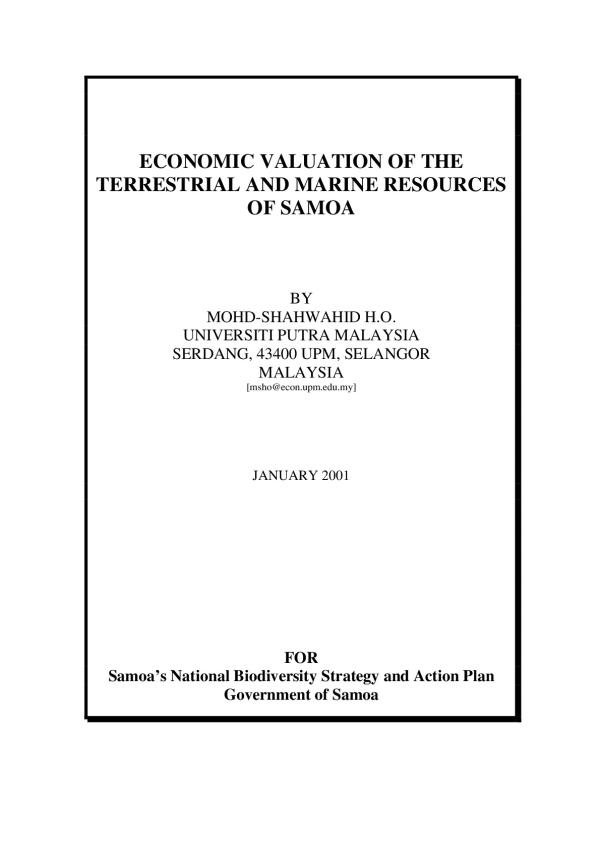 The Gross Domestic Product (GDP) provides an indicator of the growth of the economy of a nation. The GDP for Samoa in 1999 was estimated to be ST$718.4 million at current market prices, of which agriculture, fishing and indirectly tourism are the main sectors of the economy. These sectors are directly and indirectly dependent on the natural resources. Yet, the essential role played by these resources to the economy is not explicitly known since many of their services are not transacted through formal markets and in some cases markets do not exist to permit payments for their utilisation. The Samoan national government has identified the need to incorporate the economic values of these natural resources into the National Bio-diversity Strategy and Action Plan (NBSAP) with the aim of integrating biodiversity conservation with policy planning. With this in mind, research on the economic valuation of the marine and terrestrial resources, particularly forests, of Samoa was conducted from October 10 to November 24, 2000 and the findings are provided in this report.