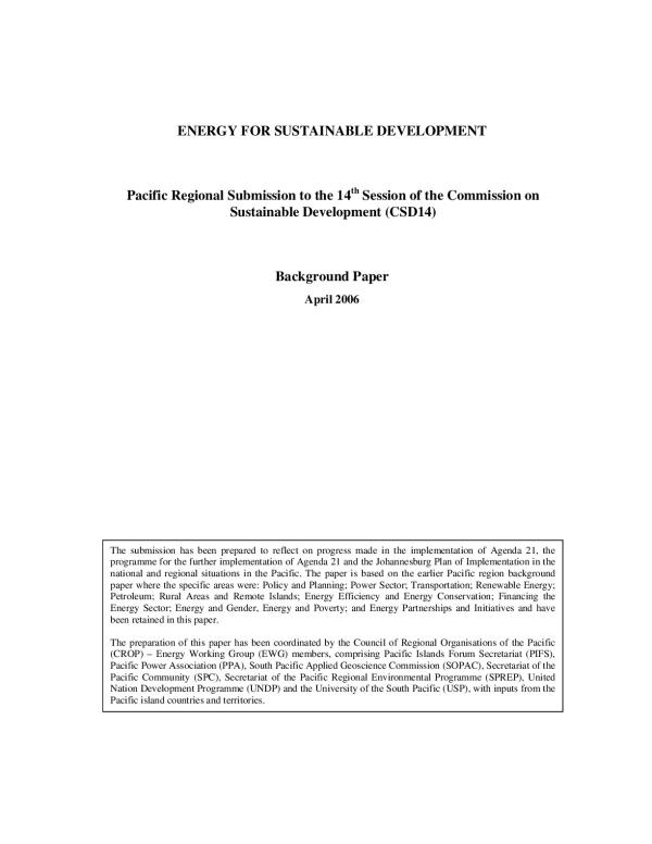 Microsoft Word - CSD14 Pacific Regional Submission-FINAL_Incl Attachments_.â¦Pacific Regional Submission to the Commission for Sustainable Development Fourteenth Session (CSD 14) Prepared by the Council of Regional Organisations of the Pacific (CROP) (Long Version: Full Text including Attachments) Background 1. The paper reviews the status of progress in Pacific small island developing States (Pacific SIDS) with specific focus on the themes of the United Nations Commission on Sustainable Development two-year cycle (CSD 14 and 15 sessions, 2006/7), namely; energy for sustainable development, industrial development, air pollution/atmosphere and climate change. 2. Input is derived from many sources including national and regional assessments for the 10-year review of the Barbados Programme of Action for SIDS undertaken in 2003-2004, the recent development of the Pacific Plan, information presented at relevant regional meetings in 2005, including the Pacific Regional Meeting to review t