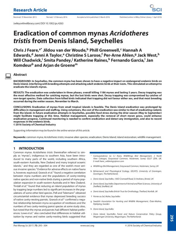 In Seychelles, the common myna has been shown to have a negative impact on endangered endemic birds on Denis Island, interfering with breeding attempts and attacking adult endemic birds at their nests. This stimulated an attempt to eradicate the island's mynas. Record Created: 08-Feb-2016