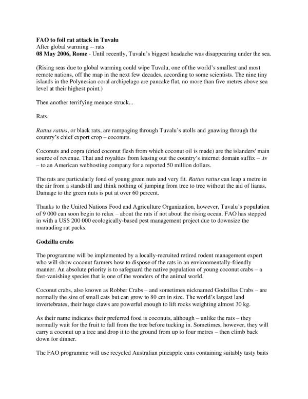Rattus rattus, or black rats, are rampaging through Tuvalu's atolls and gnawing through the country's chief export crop - coconuts. Coconuts and copra (dried coconut flesh from which coconut oil is made) are the islander's main source of revenue.