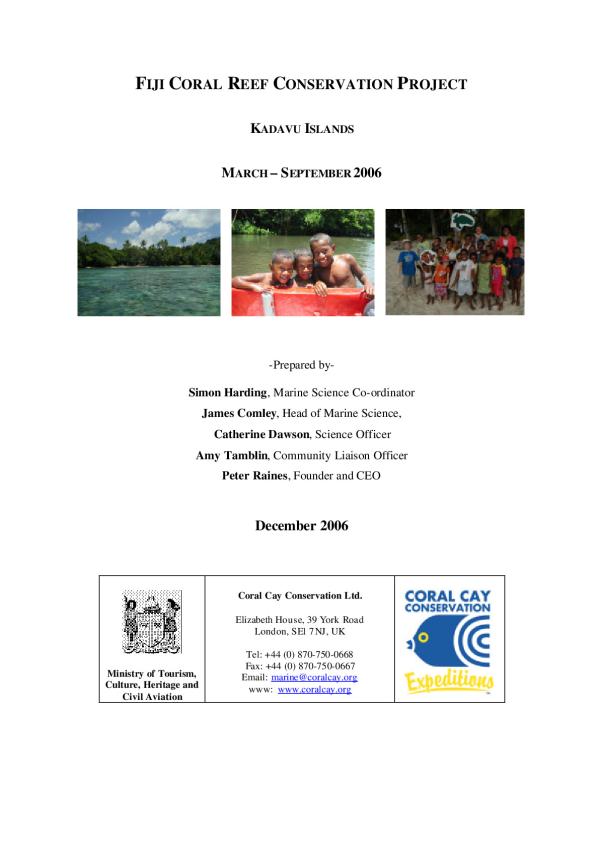 Much of Fijis wealth is generated by its extensive marine resources, which provide, for example, protein based food from fishing and income from tourism. However, a suite of factors currently threatens the ecological balance and health of many of Fijis reef ecosystems. Following on from the work conducted by CCC in the Mamanuca Islands as part of the Fiji Coral Reef Conservation Project (FCRCP), CCC were engaged in May 2005 to assist in coral reef assessment and management in the Kadavu Islands.