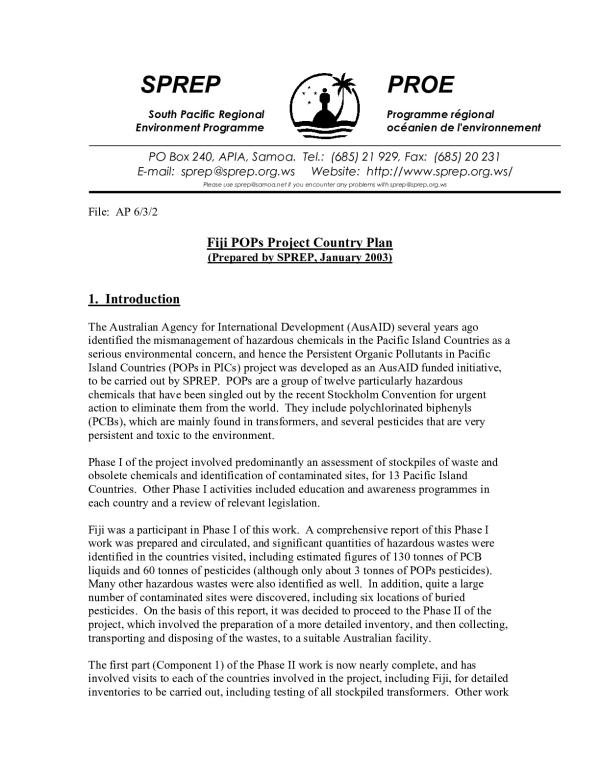 The Australian Agency for International Development (AusAID) several years ago identified the mismanagement of hazardous chemicals in the Pacific Island Countries as a serious environmental concern, and hence the Persistent Organic Pollutants in Pacific Island Countries (POPs in PICs) project was developed as an AusAID funded initiative, to be carried out by SPREP. POPs are a group of twelve particularly hazardous chemicals that have been singled out by the recent Stockholm Convention for urgent action to eliminate them from the world. They include polychlorinated biphenyls (PCBs), which are mainly found in transformers, and several pesticides that are very persistent and toxic to the environment.