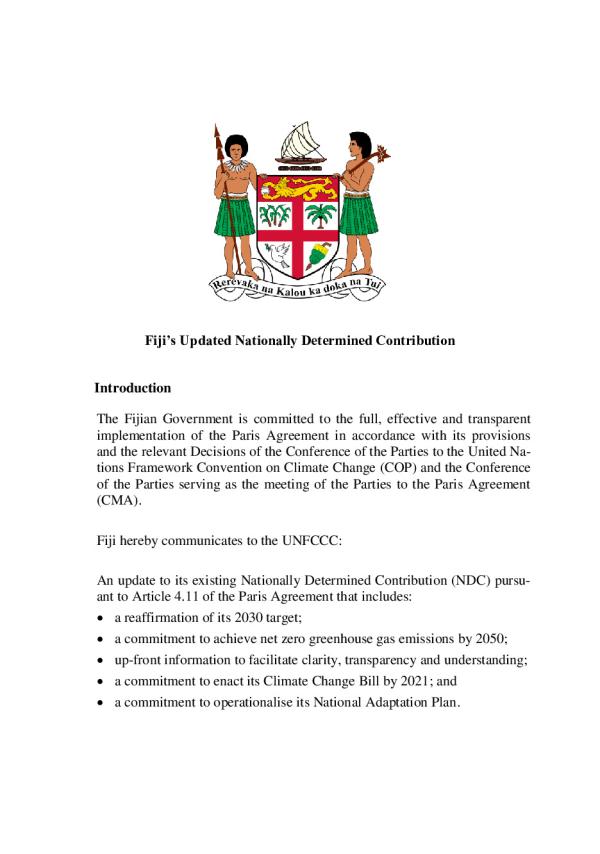The Fijian Government is committed to the full, effective and transparent implementation of the Paris Agreement in accordance with its provisions and the relevant Decisions of the Conference of the Parties to the United Nations Framework Convention on Climate Change (COP) and the Conference of the Parties serving as the meeting of the Parties to the Paris Agreement (CMA).