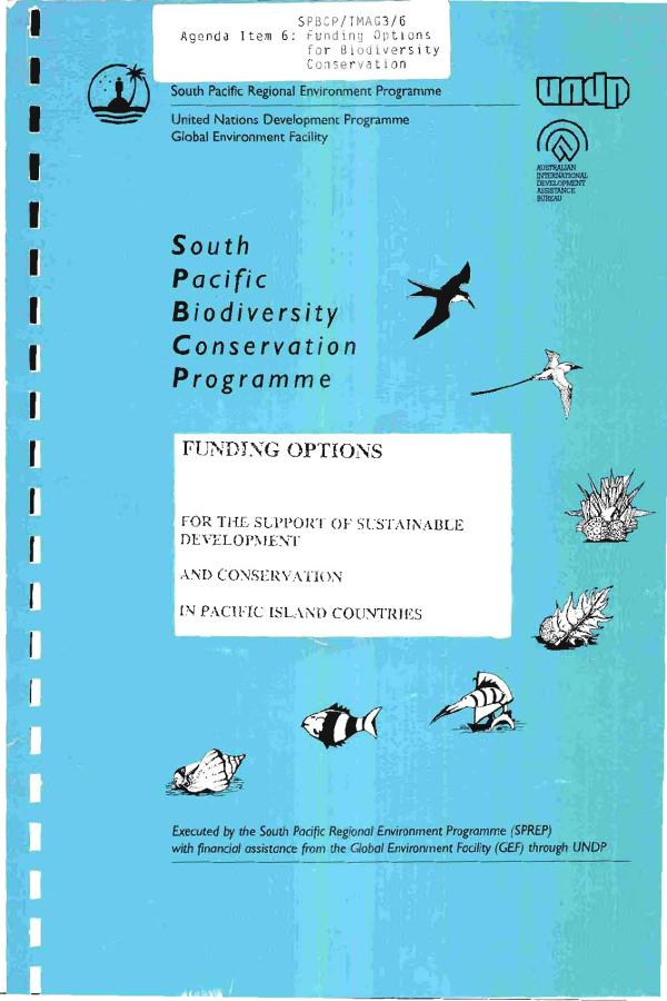 SPBCP/TI'1AG3/6 Asenda Irem 6: ;:lriT:]r?i:i:l;, Ccnserv,ltion Ssuth Pacific Regional Environment Programme United Nations Development Programm⬠Global Environment FacilitY So uth Pacific Uru II^/-\ll I ta l lt t w !I,S|TR*IJIIN IMEiS&INONII, DEI'EIOIftIENT rss rB|CE DOIEM Bi o div e rs ity Conse rvotton Progromme FUNDII\*'G OPTIONS I.'Oit [I]Il S( jI'POl{.'l' OFr -ct'S-|AINABLE DE \'}iLO t,II[,\T ,!r\ D CO\ 5l'. It\i',,\'I-I ( )\ I\ P.\CIlrIC ISL.\lrD COLTNl'l{lES Erecuted by the South Pociftc Regionol Enwronment Programm" (lpngpt wtth frnonciol ossistonce from thi Globot Fnvironment Focility (GEF) through UNDPL u_- u. o- V) FTNDI]\G OPTIONS FOR THE SUPPORT OF SUSTAINABLE DEVEINPMENT AND CONSERVATION IN PACIFIC ISLAND COUNTRIES Rtpott prepared for thc South Pacitic Biodivcrsity Conservadon hognrme of sPREP (The south Pacilic Regional Environment progranne, Apia, Westeil Sanoa May 1995 P E C L,ucas Welthgton, Nr;w ZealudContents TERIyIS OF REFERENCE TTIE FTINDING PR.OBLEM The Soutr Pacific Biodiversiry Con