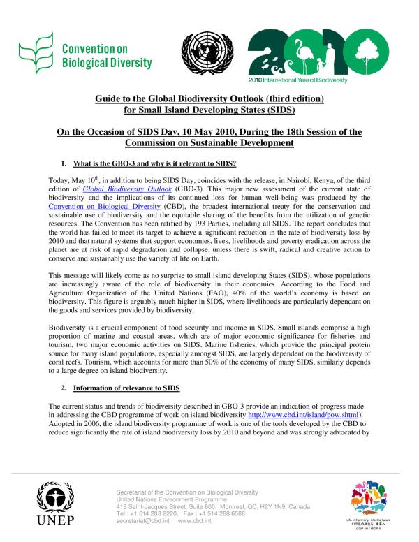 Today, May 10th, in addition to being SIDS Day, coincides with the release, in Nairobi, Kenya, of the third edition of Global Biodiversity Outlook (GBO-3). This major new assessment of the current state of biodiversity and the implications of its continued loss for human well-being was produced by the Convention on Biological Diversity (CBD), the broadest international treaty for the conservation and sustainable use of biodiversity and the equitable sharing of the benefits from the utilization of genetic resources. The Convention has been ratified by 193 Parties, including all SIDS. The report concludes that the world has failed to meet its target to achieve a significant reduction in the rate of biodiversity loss by 2010 and that natural systems that support economies, lives, livelihoods and poverty eradication across the planet are at risk of rapid degradation and collapse, unless there is swift, radical and creative action to conserve and sustainably use the variety of life on Earth.