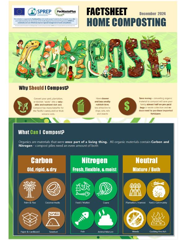 The factsheet outlines the fundamental components necessary for successful composting, focusing on achieving a balanced mix of carbon-rich (brown) and nitrogen-rich (green) materials. It introduces the 4Rs of composting - Reduce, Reuse, Recycle and Rot - as a framework for sustainable waste management. Additionally, the document offers practical tips for composting in various settings, from small urban gardens to larger community plots, and highlights the positive impacts on soil health and local ecosystems. This publication serves as a valuable tool for individuals and communities aiming to reduce waste, enhance soil fertility, and contribute to environmental sustainability in the Pacific region.