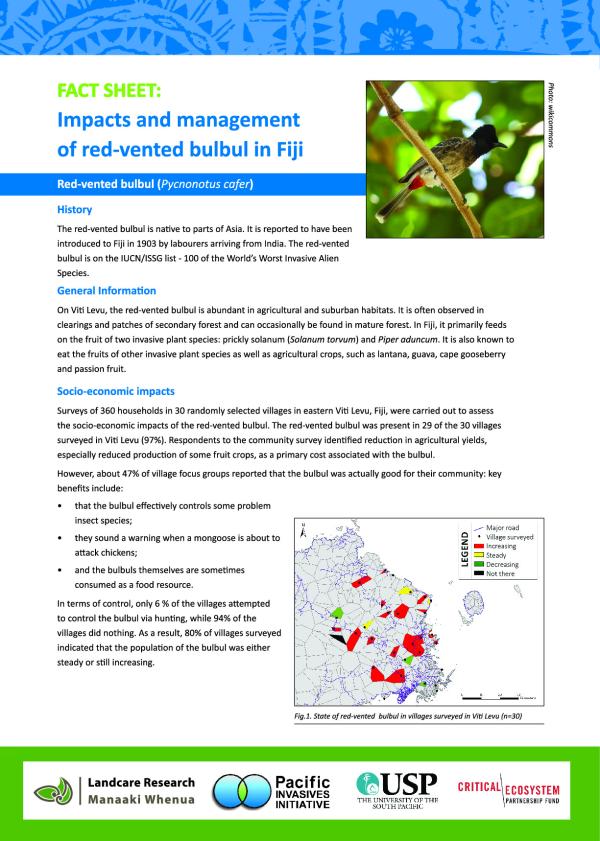 The red-vented bulbul is native to parts of Asia. It is reported to have been introduced to Fiji in 1903 by labourers arriving from India. The red-vented bulbul is on the IUCN/ISSG list 100 of the Worlds Worst Invasive Alien Species.