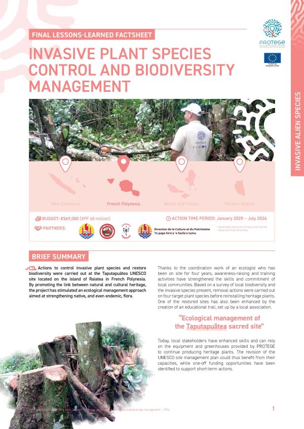 Actions to control invasive plant species restore biodiversity were carried out at the Taputapuatea UNESCO site located on the island of Raiatea in French Polynesia. By promoting the link between natural and cultural heritage, project has stimulated an ecological management approach aimed at strengthening native, and even endemic flora. Thanks to the coordination work of an ecologist who has been on site for four years, awareness-raising and training activities have strengthened the skills and commitment of local communities. Based on a survey of local biodiversity and the invasive species present, removal actions were carries out on four target plant species before reinstalling heritage plants. One of the restored sites has also been enhanced bu the creation of an educational trail set up by the local association.