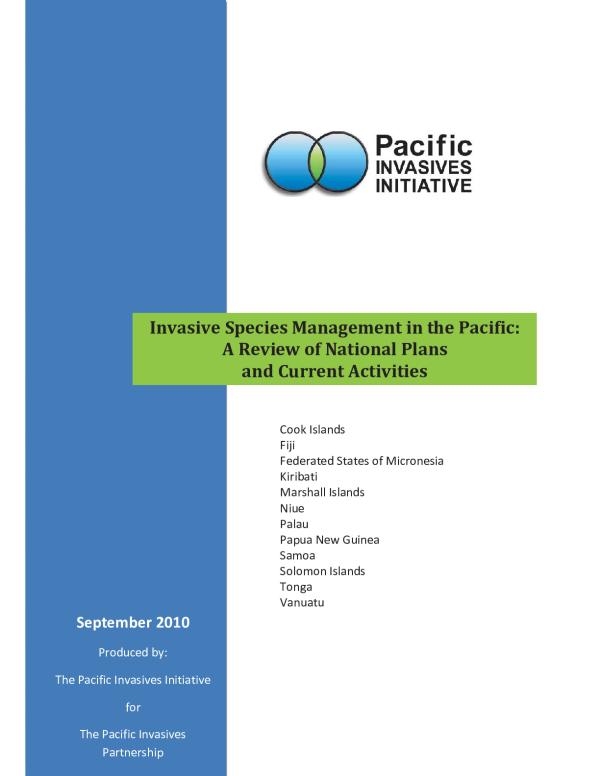 This review was prepared by the Pacific Invasives Initiative (PII) on request from the Pacific Invasives Partnership (PIP). It was undertaken to examine the invasive species management components within the National Biodiversity Strategy and Action Plans of twelve Pacific island countries (PICs): Cook Islands, Fiji, Federated States of Micronesia, Kiribati, Marshall Islands, Niue, Palau, Papua New Guinea, Samoa, Solomon Islands, Tonga and Vanuatu. The results of the review show that invasive species management is included as a component in eleven National Biodiversity Strategy and Action Plans, Marshall Islands being the only country not to include invasive species management. Five countries have also developed National Invasive Species Action Plans: Federated States of Micronesia (for Kosrae, Pohnpei and Yap), Kiribati (for Kiribati and Line Islands), Marshall Islands, Palau and Samoa; to support their National Biodiversity Strategy Action Plans and to provide a framework for invasive species management