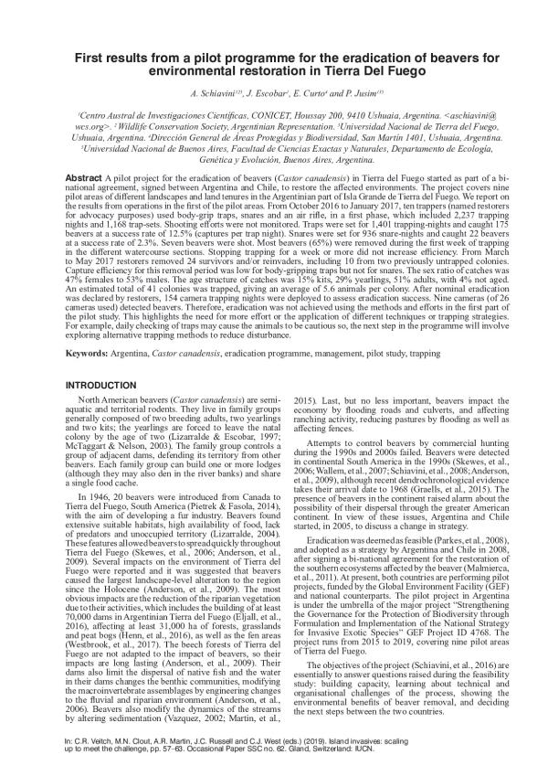 A pilot project for the eradication of beavers (Castor canadensis) in Tierra del Fuego started as part of a bi-national agreement, signed between Argentina and Chile, to restore the affected environments. The project covers nine pilot areas of different landscapes and land tenures in the Argentinian part of Isla Grande de Tierra del Fuego. We report on the results from operations in the fi rst of the pilot areas. From October 2016 to January 2017, ten trappers (named restorers for advocacy purposes) used body-grip traps, snares and an air rifle, in a first phase, which included 2,237 trapping nights and 1,168 trap-sets. Shooting eff orts were not monitored. Traps were set for 1,401 trapping-nights and caught 175 beavers at a success rate of 12.5% (captures per trap night). Snares were set for 936 snare-nights and caught 22 beavers at a success rate of 2.3%. Seven beavers were shot. Most beavers (65%) were removed during the fi rst week of trapping in the different watercourse sections. Stopping trapping for a week or more did not increase efficiency. From March to May 2017 restorers removed 24 survivors and/or reinvaders, including 10 from two previously untrapped colonies. Capture efficiency for this removal period was low for body-gripping traps but not for snares. The sex ratio of catches was 47% females to 53% males. The age structure of catches was 15% kits, 29% yearlings, 51% adults, with 4% not aged. An estimated total of 41 colonies was trapped, giving an average of 5.6 animals per colony. After nominal eradication was declared by restorers, 154 camera trapping nights were deployed to assess eradication success. Nine cameras (of 26 cameras used) detected beavers. Therefore, eradication was not achieved using the methods and eff orts in the first part of the pilot study. This highlights the need for more eff ort or the application of different techniques or trapping strategies. For example, daily checking of traps may cause the animals to be cautious so, the next step in the programme will involve exploring alternative trapping methods to reduce disturbance.