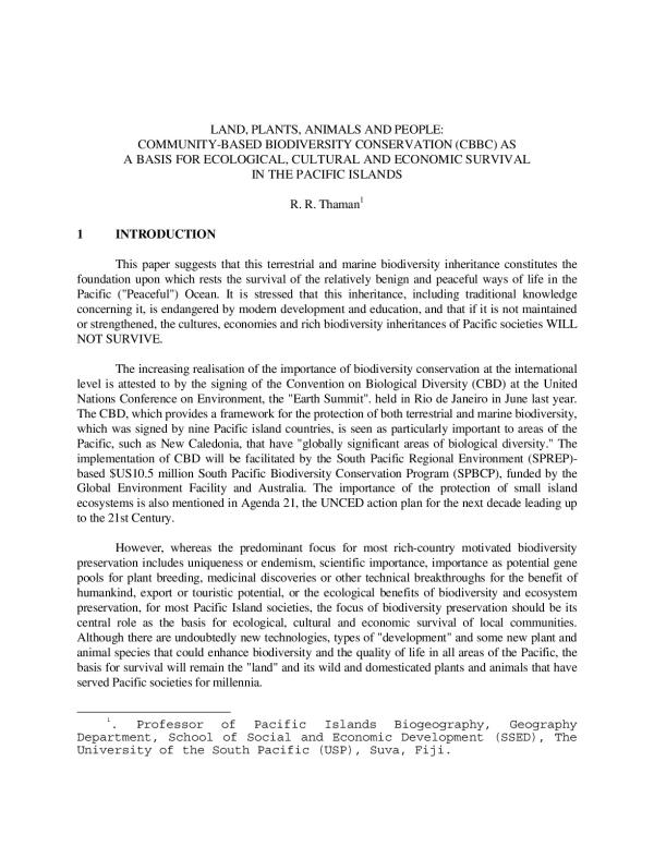 This paper suggests that this terrestrial and marine biodiversity inheritance constitutes the foundation upon which rests the survival of the relatively benign and peaceful ways of life in the Pacific ("Peaceful") Ocean. It is stressed that this inheritance, including traditional knowledge concerning it, is endangered by modem development and education, and that if it is not maintained or strengthened, the cultures, economies and rich biodiversity inheritances of Pacific societies WILL NOT SURVIVE.