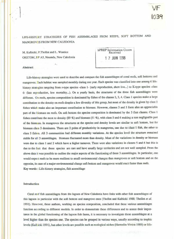 Life-history strategies were used to describe and compare the fish assemblages of coral reefs, soft bottoms and mangroves. Each habitat was sampled monthly during one year. Each species was classified into one among 6 life- history strategies rangeing from r-type species -class 1- (early reproduction, short live...) to K-type species class 6- (late reproduction, low mortality...). On a yearly basis, the structures of the three fish assemblages were different. On reefs, species composition is dominated by fishes of the classes 2,3,4. Class 1 species make a large contribution to the density on reefs despite a low diversity of this group, but most of the density is given by class 2 fishes which make also an important contribution to biomass. However, classes 3 and 5 form also an appreciable pan of the biomass on reefs. On soft bottom the species composition is dominated by the 3 first classes. Class 1 fishes contribute the most to density (89 %) and biomass (51 %), with class 5 and 6 making a non negligeable part of the biom ass. In mangroves the structures at the species and density levels are similar to soft bottom, but for biomass class 3 dominates. There are 2 poles of productivity in mangroves, one due to class 1 fish, the other to class 3 fishes. All 3 communities had different monthly variations. At the species level the structure remained stable for all 3 assemblages. Biomass fluctuated more than density. Most of the variations in density or biomass were due to class 1 and 2 which have a higher turnover. There were also variations in classes 5 and 6 but this is due to the fact that these species are rare and have usually large territories and are not well sampled. From the above data it was possible to outline the major aspects of the functioning of these 3 assemblages. In particular, one would expect reefs to be more resilient to small environmental changes than mangroves or soft bottom and on the opposite, in case of a major environmental change soft bottom and mangroves would react faster than reefs. Key words : Life-history strategies, fish assemblage