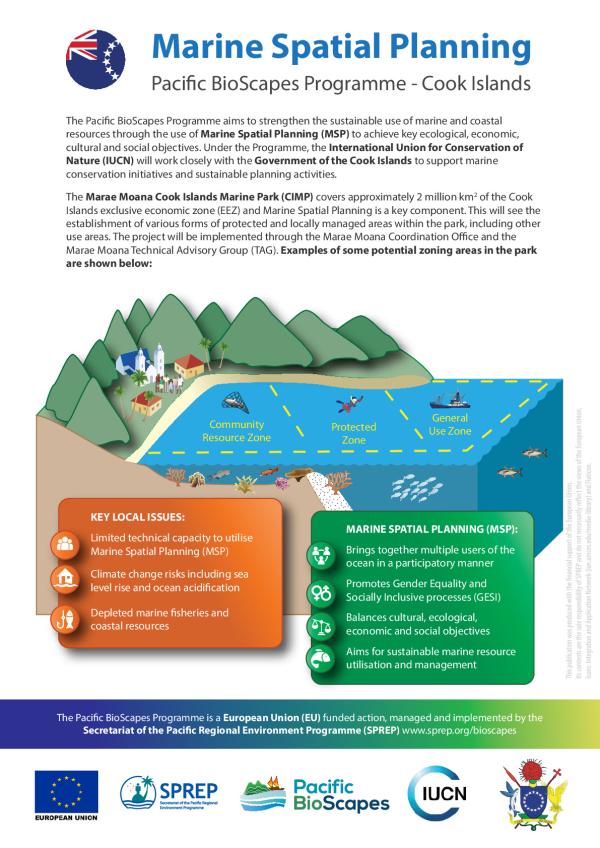 The Pacific BioScapes Programme aims to strengthen the sustainable use of marine and coastal resources through the use of Marine Spatial Planning (MSP) to achieve key ecological, economic, cultural and social objectives. Under the Programme, the International Union for Conservation of Nature (IUCN) will work closely with the Government of the Cook Islands to support marine conservation initiatives and sustainable planning activities.