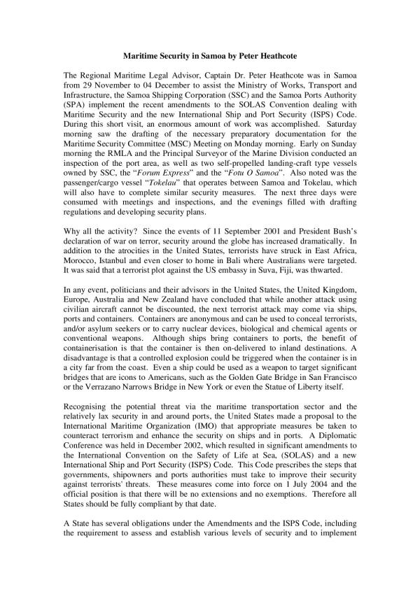 The Regional Maritime Legal Advisor. Captain Dr. Peter Heathcote was in Samoa from 29 November to 04 December to assist the Ministry of Works. Transport and Infrastructure, the Samoa Shipping Corporation (SSC) and the Samoa Ports Authority (SPA) implement the recent amendments to the SOLAS Convention dealing with Maritime Security and the new International Ship and Port Security (ISPS) Code. During this short visit, an enormous amount of work was accomplished. Saturday morning saw the drafting of the necessary preparatory documentation for the Maritime Security Committee (MSC) Meeting on Monday morning. Early on Sunday morning the RMLA and [the Principal Surveyor of the Marine Division conducted an inspection of the port area, as well as two self-propelled landing-craft type vessels owned by SSC, the "Forum Express" and the "Fora O Samoa". Also noted was the passenger/cargo vessel "Tokelau' that operates between Samoa and Tokelau, which will also have to complete similar security measures. The next three days were consumed with meetings and inspections, and the evenings filled with drafting regulations and developing security plans.