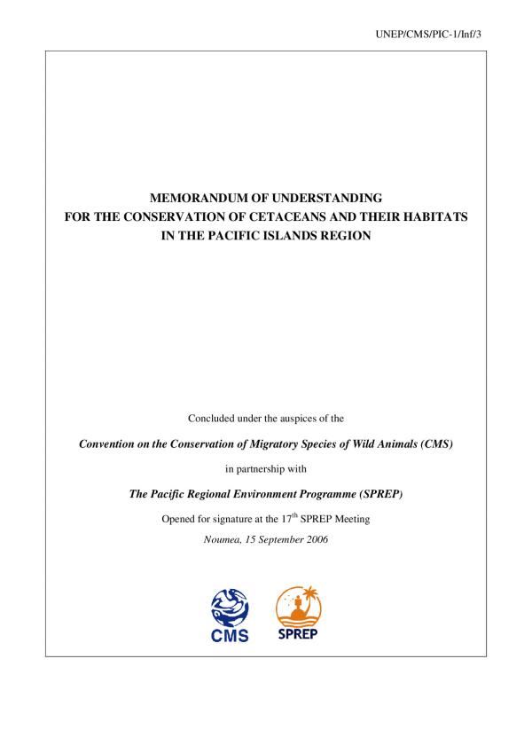 Concluded under the auspices of the Convention on the Conservation of Migratory Species of Wild Animals (CMS) in partnership with The Pacific Regional Environment Programme (SPREP) opened for signature at the 17th SPREP meeting, Noumea 15th September 2006