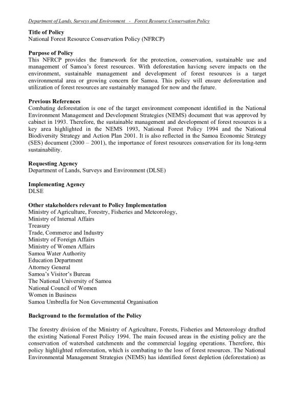 This NFRCP provides the framework for the protection, conservation, sustainable use and management of Samoa's forest resources. With deforestation having severe impacts on the environment, sustainable management and development of forest resources is a target environmental area or growing concern for Samoa. This policy will ensure deforestation and utilization of forest resources are sustainably managed for now and the future.