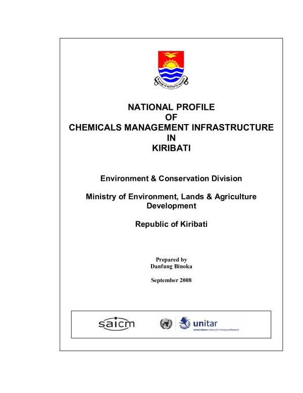 This project of updating of the National Chemical Profile for Kiribati is a series of global efforts in achieving the goal of "Agenda 21" on "Environmentally Sound Management of Toxic Chemicals". This Profile was developed under the guidance of UNITAR and in close consultation with national stakeholders. The Chemical Profile reports on the current state of chemicals including pesticides, industrial, and consumer chemicals. The Profile consists of chemicals inventory and information on production, import, export and use: ministries and agencies managing chemicals, issues contributing to health and environmental problems at various stages of their life-cycle, and priority concerns identified. Existing legal and non-legal mechanisms for chemical management, co-coordinating mechanisms, data access and use, technical infrastructure, international linkages, awareness and understanding of workers and the public, and resources available for chemicals management are also reported.