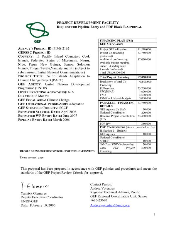 The PACC will implement long-term adaptation measures to increase the resilience of a number of key development sectors in the Pacific islands to the impacts of climate change. This objective will be achieved by focusing on long-term planned adaptation response strategies, policies and implementation measures to bring about this result. The key development sectors this project will focus on are water resources management; food production and food security; coastal zone and associated infrastructure (roads and breakwater). To ensure sustainability of the project, regional and national adaptation financing instruments will also be developed.