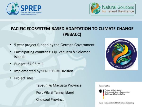 Slide 1 PACIFIC ECOSYSTEM-BASED ADAPTATION TO CLIMATE CHANGE (PEBACC) ⢠5 year project funded by the German Government ⢠Participating countries: Fiji, Vanuatu & Solomon Islands ⢠Budget: â¬4.95 mill. ⢠Implemented by SPREP BEM Division ⢠Project sites: Taveuni & Macuata Province Port Vila & Tanna Island Choiseul Province EbA is integrated into development, climate change adaptation responses, and natural resource management policy and planning processes in three Pacific islands countries providing replicable models for other countries in the region. Overall intended outcome Outputs 1. Ecosystem and socio-economic resilience analysis and mapping (ESRAM) completed as a basis for adaptation planning at the national, provincial and community levels 2. EbA options analysed, prioritised and plans developed 3. EbA plans implemented with demonstrated benefits 4. Communication and outreach products developed to promote integration of EbA options into climate change policies, p