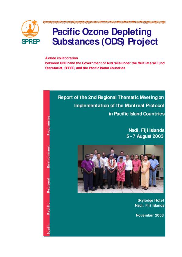 This report describes the proceedings of the 2nd Regional Thematic Meeting for Implementation of the Montreal Protocol in Pacific Island Countries held in Nadi, Fiji 5 7 August 2003 at the Skylodge Hotel. This meeting was attended by representatives from the South Pacific Regional Environment Programme (SPREP), United Nations Environment Programme Division of Technology, Industry and Economics (UNEP DTIE), UNEP Regional Office for Asia and the Pacific (UNEP ROAP), representatives from Governments of Australia, and the Pacific Island Countries (PICs): Cook Islands, Fiji, Nauru, Papua New Guinea, Republic of the Marshall Islands, Samoa, Solomon Islands, Tonga, and Tuvalu.