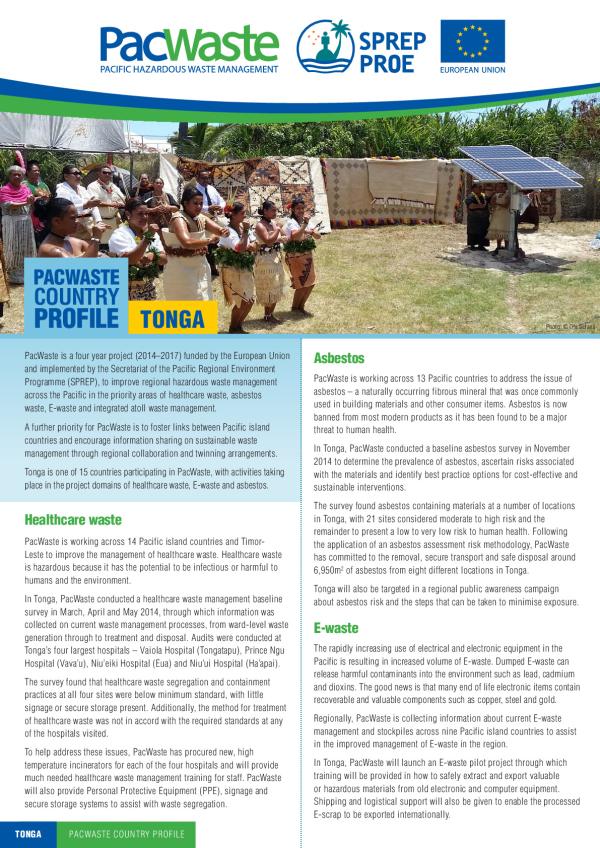 PACWASTE COUNTRY PROFILETONGA PacWaste is a four year project (2014â2017) funded by the European Union and implemented by the Secretariat of the Pacific Regional Environment Programme (SPREP), to improve regional hazardous waste management across the Pacific in the priority areas of healthcare waste, asbestos waste, E-waste and integrated atoll waste management. A further priority for PacWaste is to foster links between Pacific island countries and encourage information sharing on sustainable waste management through regional collaboration and twinning arrangements. Tonga is one of 15 countries participating in PacWaste, with activities taking place in the project domains of healthcare waste, E-waste and asbestos. Healthcare waste PacWaste is working across 14 Pacific island countries and Timor- Leste to improve the management of healthcare waste. Healthcare waste is hazardous because it has the potential to be infectious or harmful to humans and the environment. In Tonga, PacWaste conducted a he