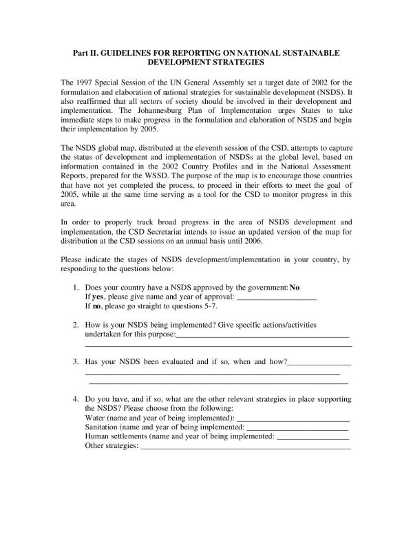 The 1997 Special Session of the UN General Assembly set a target date of 2002 for the formulation and elaboration of national strategies for sustainable development (NSDS). It also reaffirmed that all sectors of society should be involved in their development and implementation. The Johannesburg Plan of Implementation urges States to take immediate steps to make progress in the formulation and elaboration of NSDS and begin their implementation by 2005.