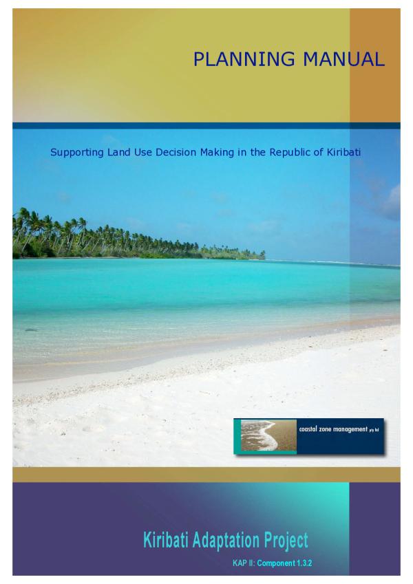 This ?Manual ?is ?designed ?to ?provide? guidance ?to ?decision ?makers ?by ?summarising ?the ?key? outcomes? of ?work ?conducted ?under ?two ?components ?of ?the ?Kiribati ?Adaptation ?Program? (KAP?II) ?(Component? 1.3.2 ?and ?Component?1.4.0). ?Consultants ?involved ?in ?each ?of ?these ?components ?of ?the ?KAP?II ?worked? in ?unison ?to? develop ?in formation ?on ?projected ?sea?level?rise ?in ?Kiribati ?and ?the? hazard ?extent ?relative? to? each ?projected ?sea?l evel?rise, ?including?, ?storm ?tide ?levels.? This? information? is? valuable? for? decision? makers? across? Government? departments? and? should? be? readily? accessible? for? inclusion? in? decision?making? processes.? Consequently,? the? objective? of? this? Manual? is? to? summarise? the? primary? outcomes? of? the? work? conducted? to? establish? projected? sea? level?rise?in?Tarawa?under?a?range?of?timeframes?and?scenarios.?This?information?should?be?applied? to?support?decisions?across?the?government?of?Kiribati?(GoK)?that?influence?the?use?and?development? of? land? and? its? resources.? For? example,? the? information? may? support? decision? making? for? urban? development?and?the?location?and?design?of?key?infrastructure